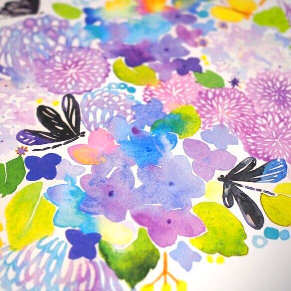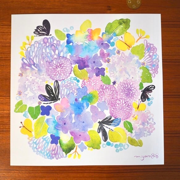 30cm×30cm 水彩画ポスター 「ハグロトンボと紫陽花」