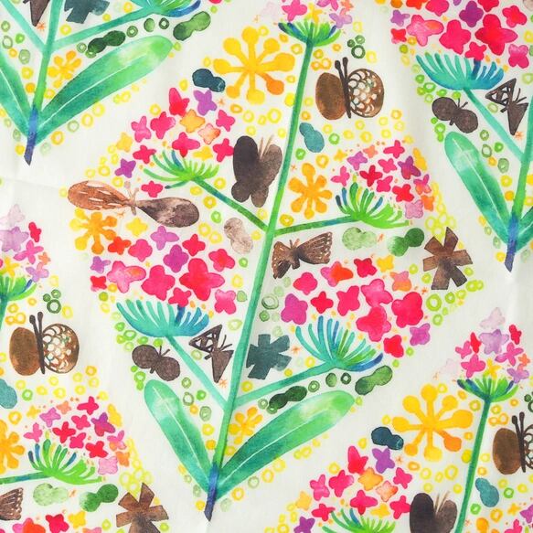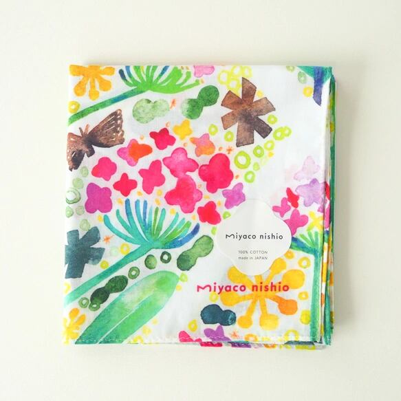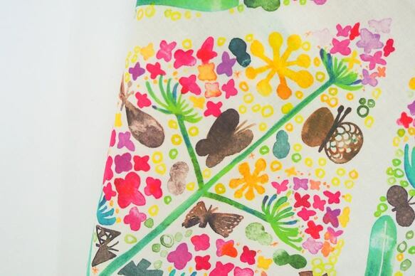 水彩画の印象をフルカラープリントで再現した華やかなハンカチは